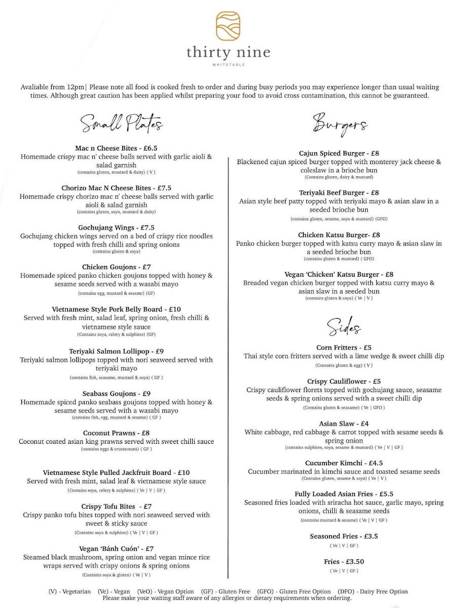 The menu at Thirty Nine Whitstable reflects a commitment to high-quality, fresh ingredients. Offering a variety of dishes that cater to diverse tastes, the menu features everything from classic British favorites to more contemporary flavors with an inventive twist. Whether you're a seafood lover craving the catch of the day, or a vegetarian seeking a hearty, flavorful meal, this restaurant delivers on all fronts. The standout dishes include the perfectly cooked pan-seared scallops, which are always a crowd-pleaser, and the indulgent homemade desserts that promise to leave you satisfied.